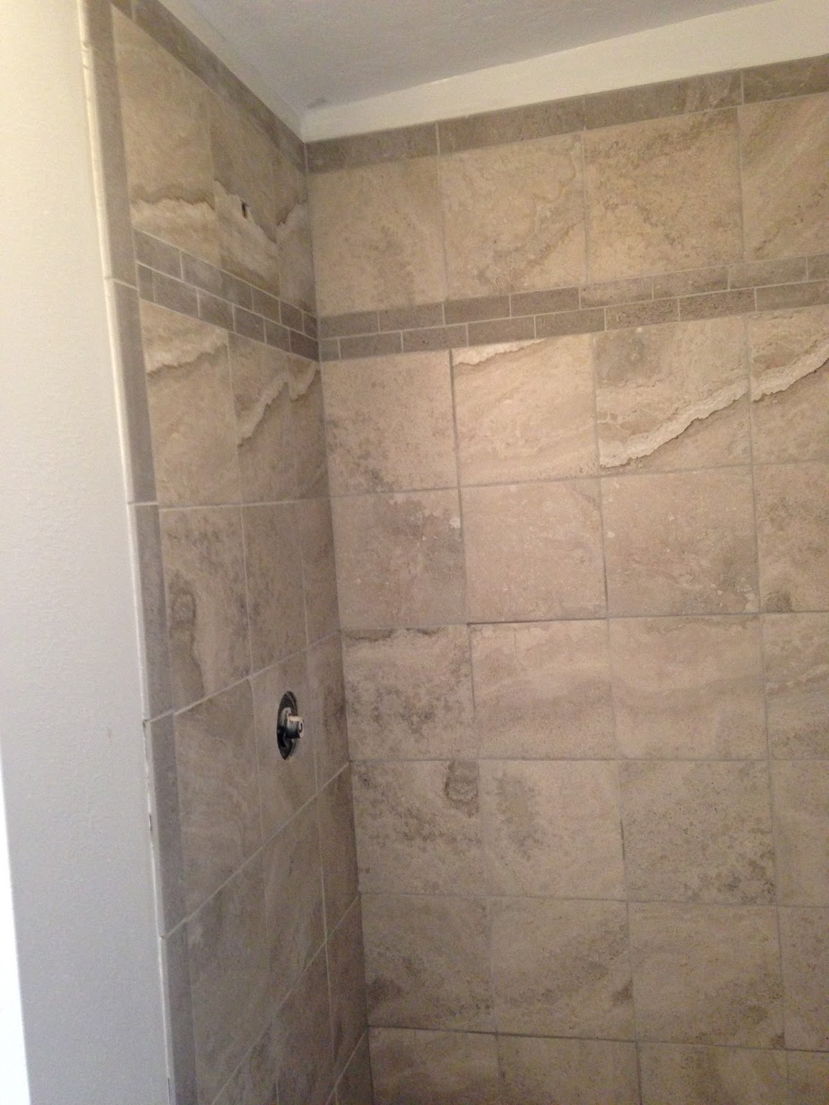On 11/8, I showed photos of the main bathroom. MT had been working on the tile in the shower and along the bathtub. That's all done now and it looks good.